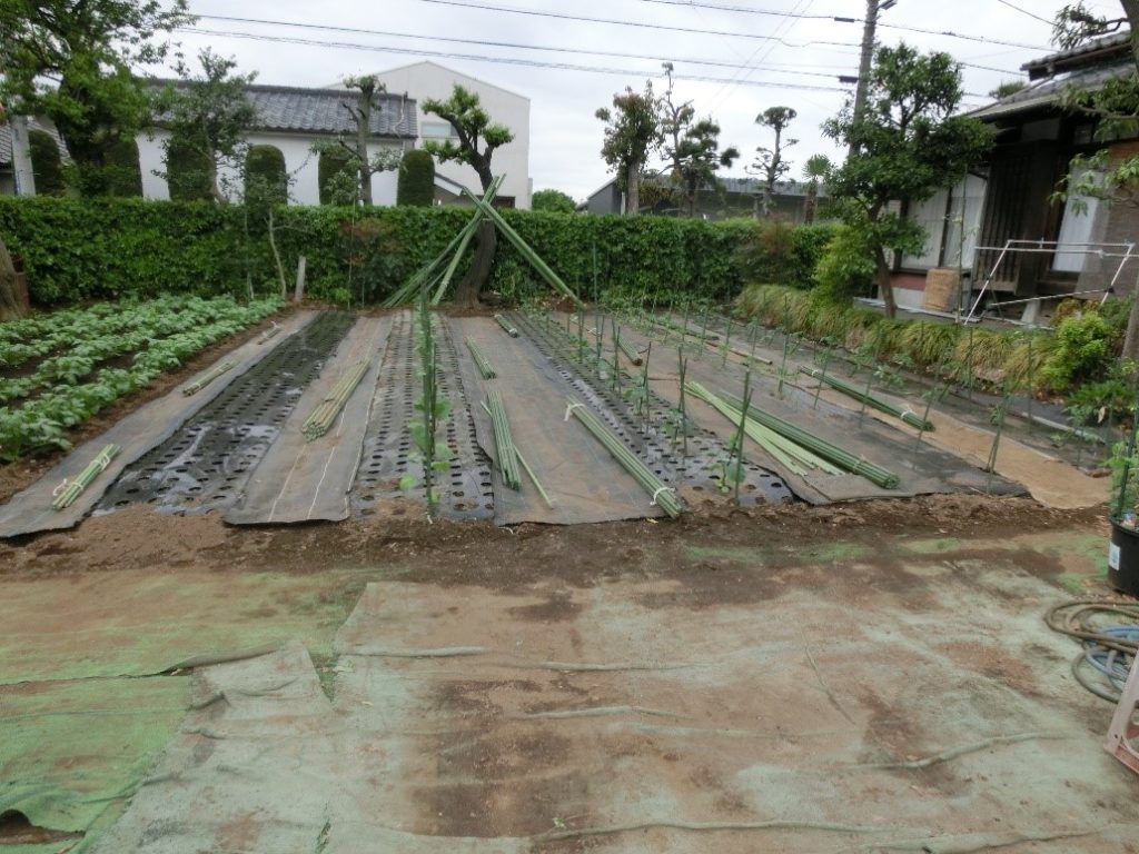 各種夏果菜の定植、支柱立てを終了する。