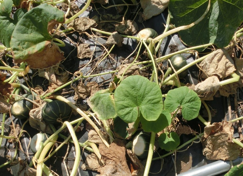 カボチャがこのところの太陽の日の強さで日焼けしてしまう。