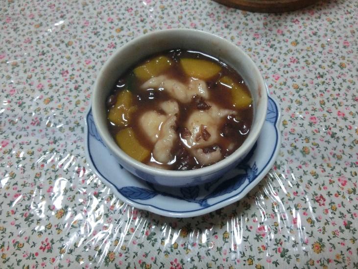 冬至の料理は、小豆を利用したお汁粉に、小麦粉のダンゴ、カボチャを加えたものを食べることとしている。食事前に荒神様にお供えし、灯明を燈し、家族が安心して過ごせた感謝をし、これからの健康、ご加護を祈る。 -